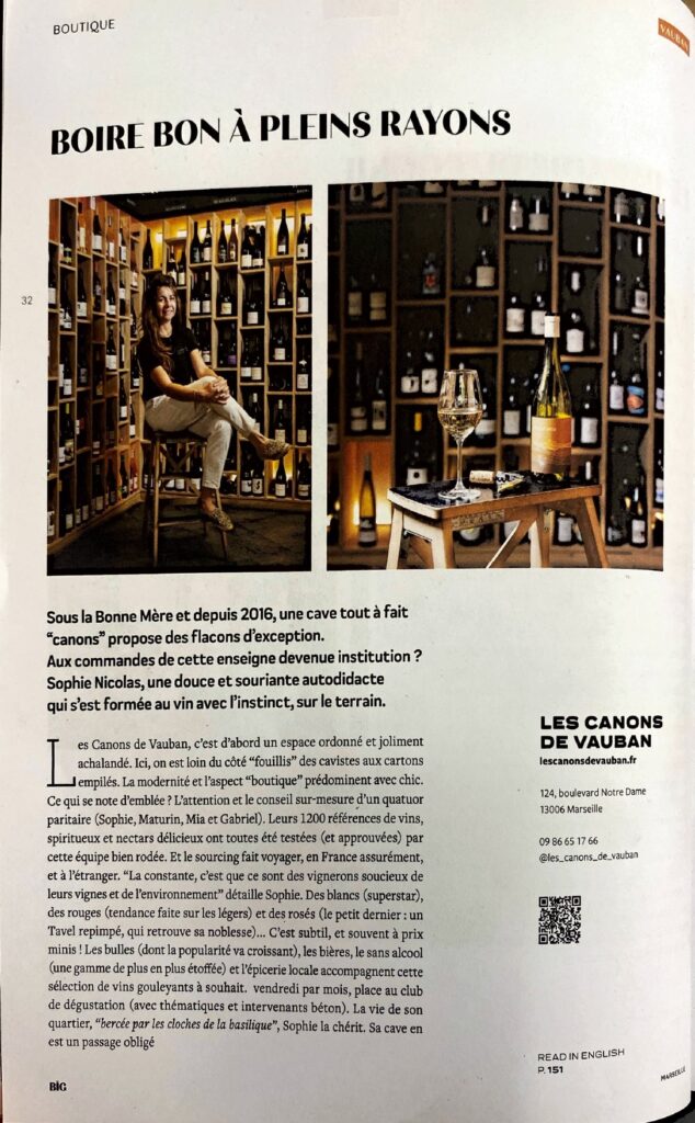 La meilleure défense, c’est l’attaque… en bouche bien sûr, quand le vin délivre ses premières sensations. Des ces canons-là, vous en tirerez foison sur place ou à la maison. Un nom prédestiné pour travailler le vin mais pas forcément le pedigree. Qu’importe puisque après l’école hôtelière, le passage par un établissement de luxe à Paris (Royal Monceau) et une étape au Château La Coste, Sophie Nicolas a enfin réussi son pari en ouvrant il y a 7 ans une cave à vins de quartier, en toute simplicité qui s’est fait un nom bien au-delà des pentes de la Bonne Mère.